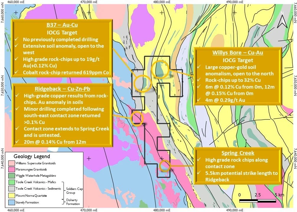 The Glen Idol Project is located immediately east of the Cloncurry Fault zone, and contains extensive copper, gold, lead, and zinc anomalism, defined by stream sediment, soil, and rock-chip sampling. Focus for previous exploration was the Willys Bore Target, a copper-gold-lead-zinc zone of anomalism, with previously reported drilling results including: